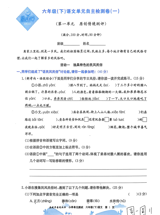 2026《孟建平·小学单元测试》(1-6年级下)(语文)
