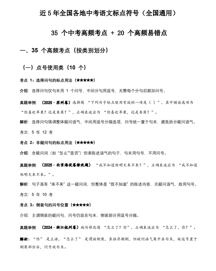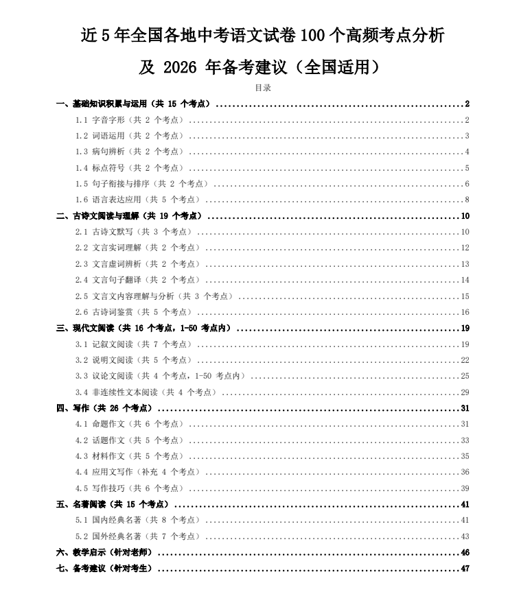 1.近5年全国各地中考语文试试卷100个高频考点分析及备考建议