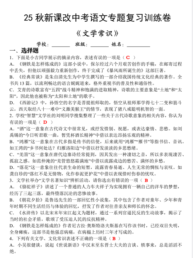 2026《初中语文资料》中考文学常识专题复习训练卷.pdf