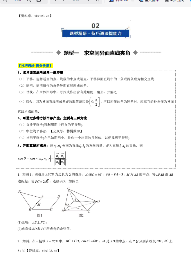 题型一 求空间异面直线夹角…………………………………………………………………………………………………………5
