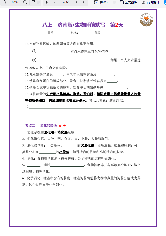 2026八年级上册生物晨读晚默 默写版 苏科版