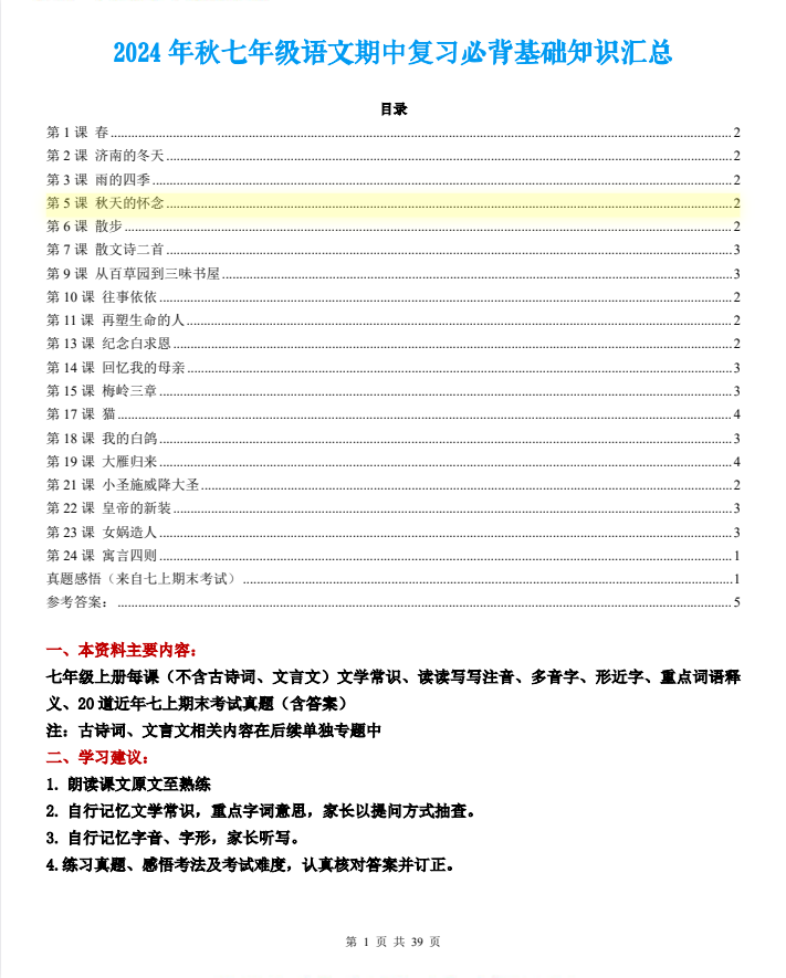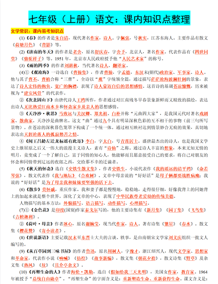 七上-必背基础知识汇总(新教材)(分享),pdf