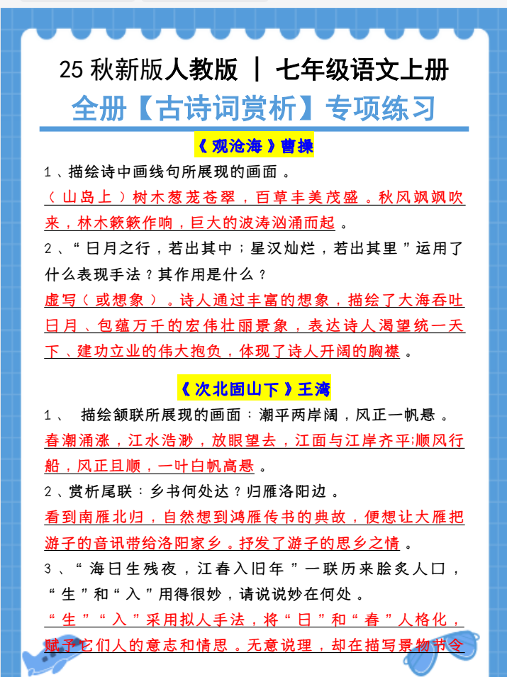 【2025秋新版】七年级语文上册:全册【古诗词析】….答案).pdf