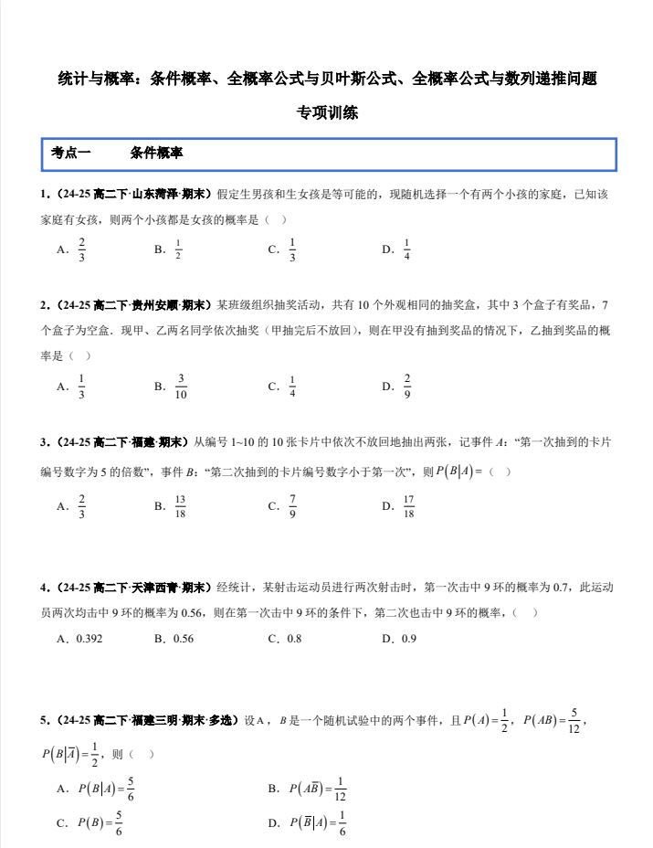 统计与概率:条件概率、全概率公式与贝叶斯公式、全概率公式与数列递推问题专项训练专项训练