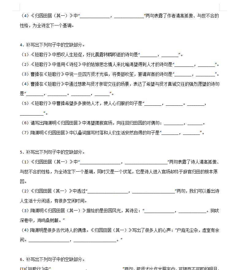 第01练必修上册《短歌行》《归园田居(其一)》理解性默写-2023年高考语文古诗文名句名篇默写每日一练(统编版全五册)